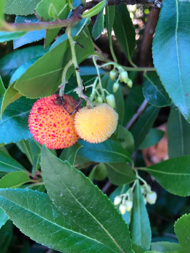 The strawberry tree never blooms profusely. It instead blooms sporadically throughout the year, with berries ripening at random times. You probably noticed that some trusses of fruit supported berries in various degrees of ripeness, ranging from green to yellow to orange to red. The fruit is rather bland, so is left for the birds.