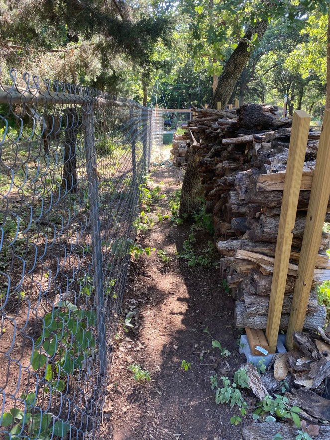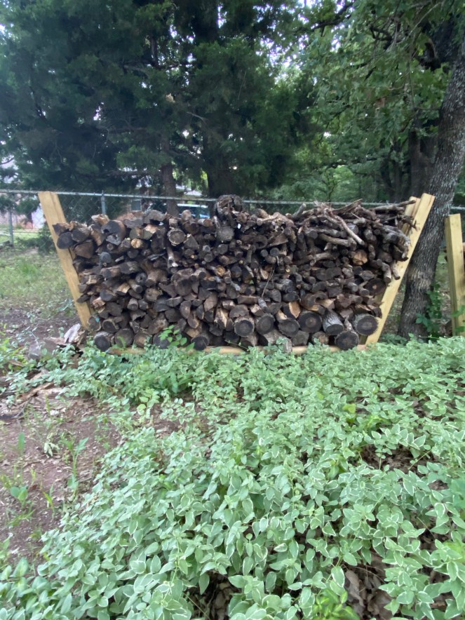 Brad loves a fireplace, and prefers wood-burning to gas. Our house has that. The previous owners left a disheveled stack of wood which we haphazardly added to when we had a few trees taken down two years ago. The area was just a mess but didn’t seem to warrant my attention until this summer. Mainly, I needed that space to expand and grow my garden footprint.