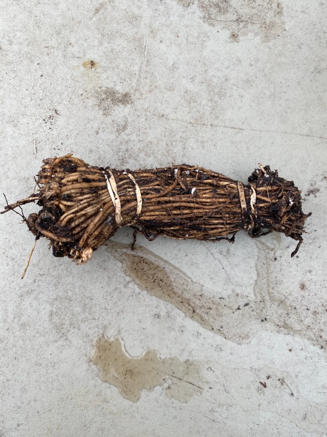 The packages I purchased said “2 year” – so I am assuming that this is their second year of life. Still, it’s their first year in my ground – so I think that timing will impact my ability to harvest in the short-term. Per the instructions, I was to plant the “crowns” eight (8) inches deep in rows that are four (4) feet apart. Within each row, the crowns are 8-12 inches apart. The crowns came bunched together. I soaked the entire bunch in a compost tea while I was digging the holes. Each hole had to be wide enough to spread the roots out so that the asparagus can grow properly. The first summer, no harvest is expected. During the second summer, I can harvest for two to three weeks – although some sources say do not harvest at all. In the third summer, harvest expands to four to six weeks. And then after that, harvesting could take place for eight to twelve weeks.