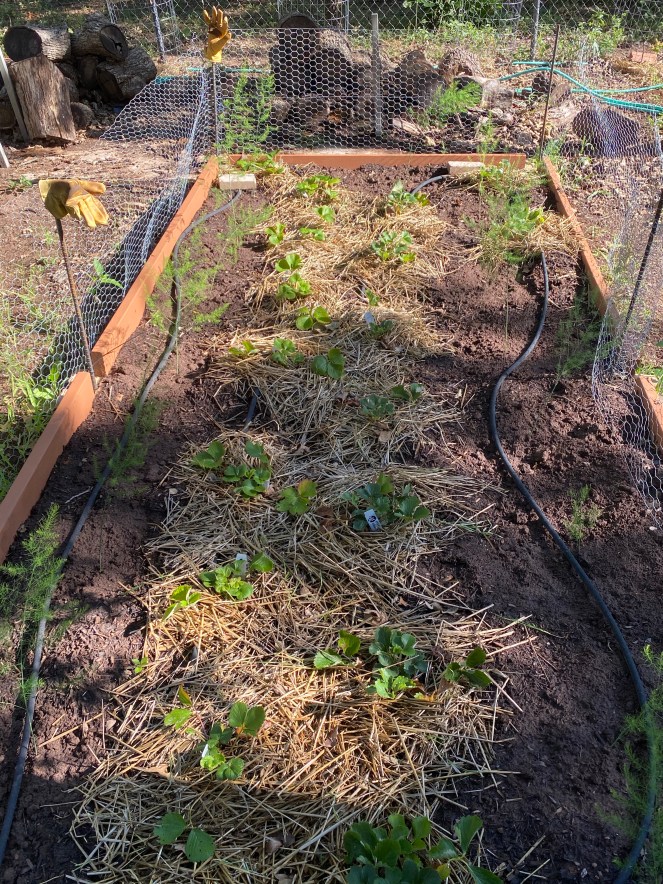 I went back in this weekend to fill the holes and cover the area with straw mulch. And I have been pinching blooms from the strawberry plants every day.