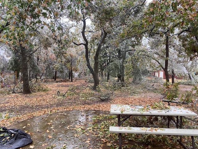 An ice storm rolled into Oklahoma City last Monday (October 26th). The prediction was brutal as many trees still had their leaves. The weight of the ice on the leaves would mean broken limbs and fallen trees.  It would also mean power outages. We lost our power at 2:45pm on Monday. It still has not returned. We have been told that it will be restored by 11pm on Friday (November 6th). That means eleven days without electricity for those of you counting at home! And since we have a water well run with an electric pump, we have no water either.